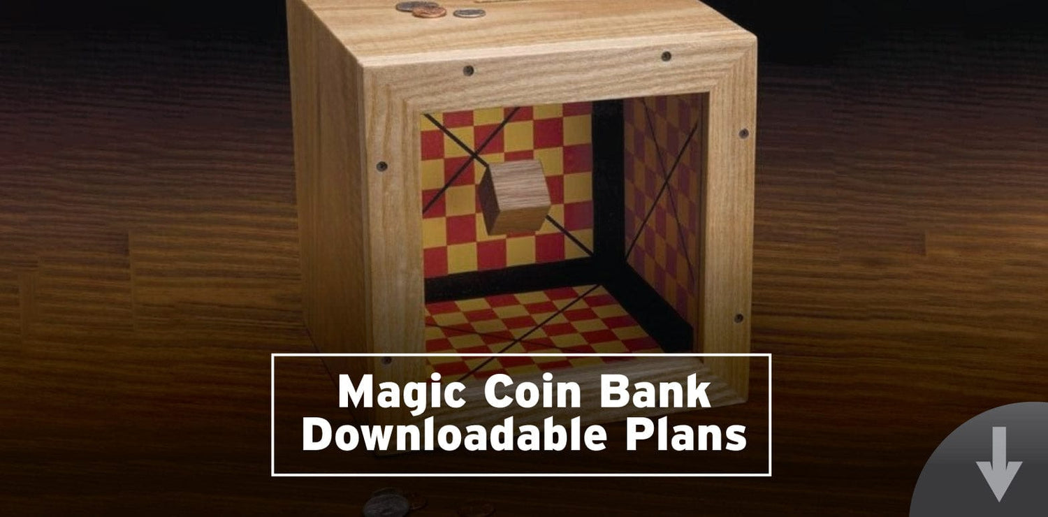 This bank magically makes coins dropped in the slot seem to disappear, leaving the box empty except for the "floating" wooden cube in the center.